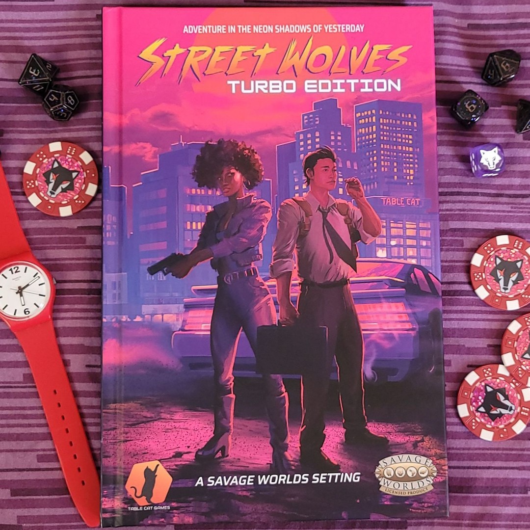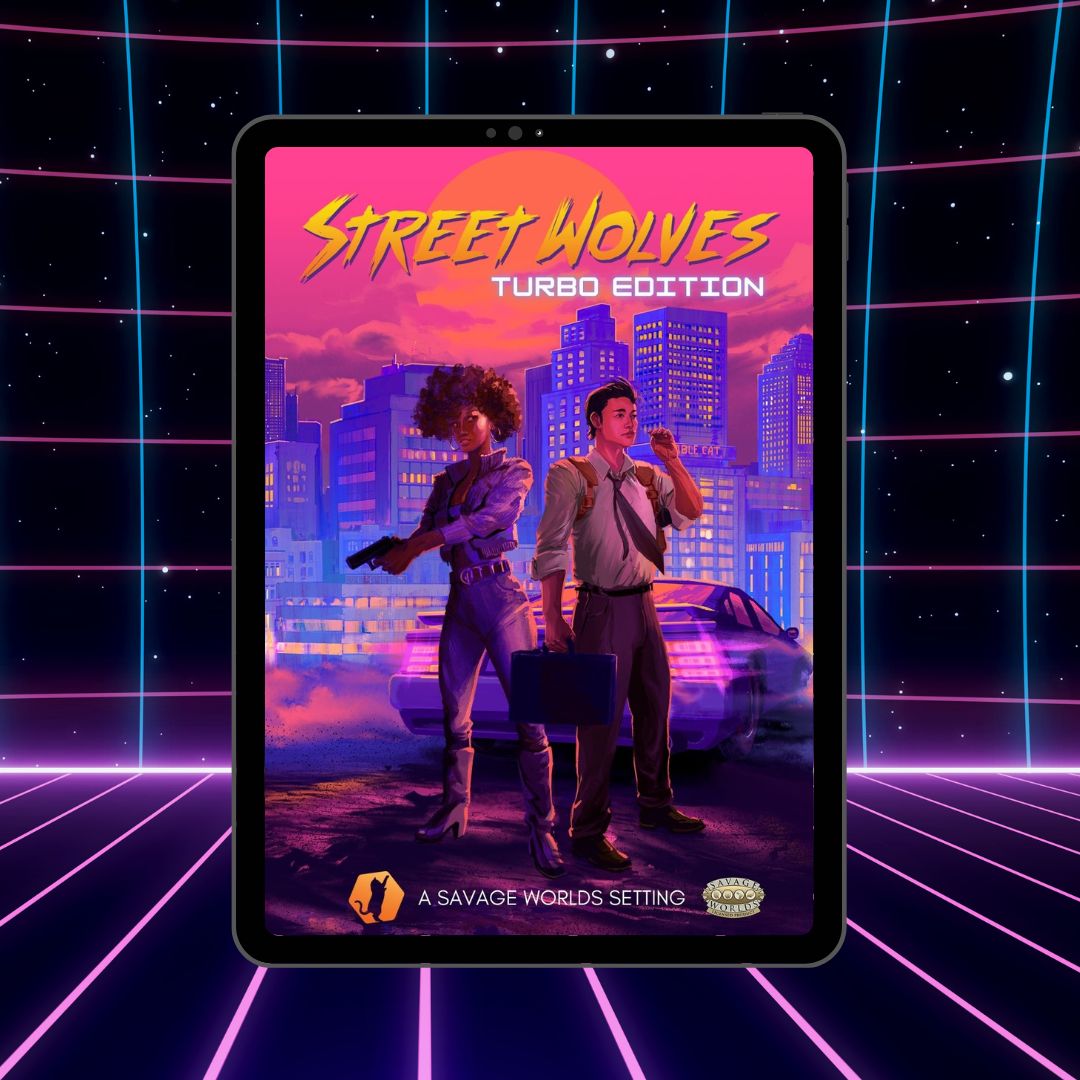 Street Wolves: Turbo Edition features all the background, lore, gear, edges, hindrances, and characters you need to play in a retro 1980s table top roleplaying game setting. Plus is has tons of totally rad art and a cool thematic style.